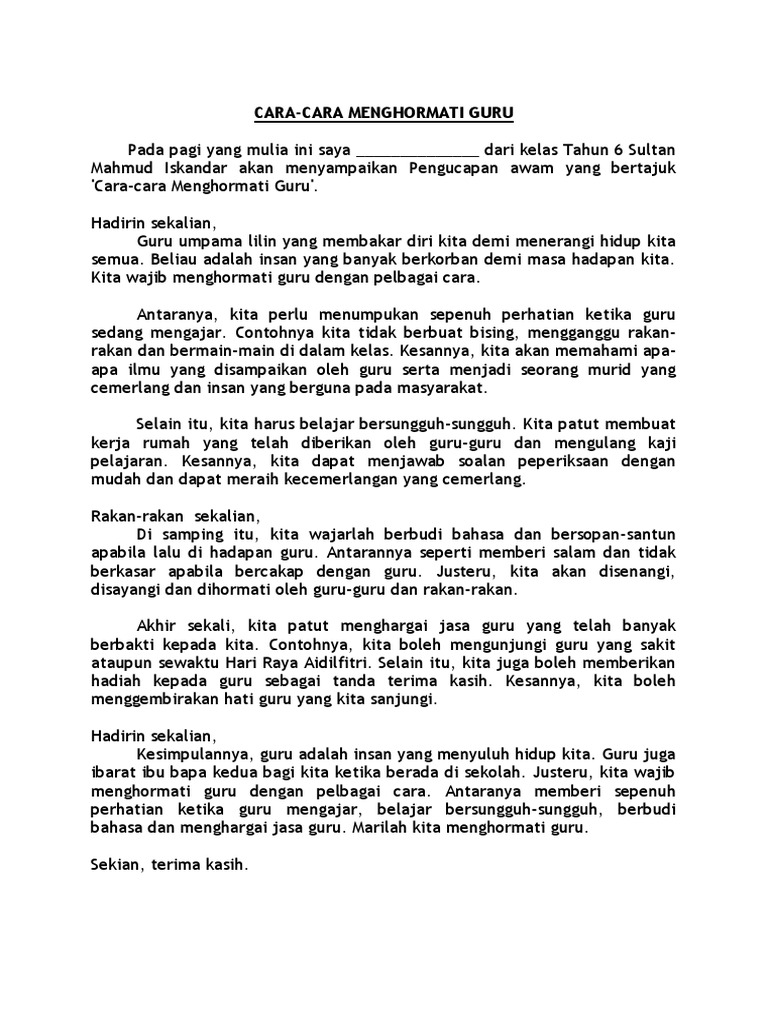 Contoh Karangan from imgv2-2-f.scribdassets.com Bagimanakah cara menghormati guru dalam ajaran islam sebgaimana pentingnya kedudukan guru dalam islam. Sejauh ini memang banyak sekali anak anak yang belum paham arti menghormati. Sikap ini adalah cara menghormati yang manfaatnya akan juga bagi diri anda karena mampu menyelesaikan apa yang diperintahkan oleh guru. Guru adalah orang yang telah mendidik dan mengajarkan ilmu kepada kita. Semasa kita berada di sekolah, gurulah yang menjaga dan mendidik kita. Berbakti kepada guru dan berbuat baik itu kewajiban seorang murid, seorang guru yang membentuk perilaku dan karakter muridnya menjadi lebih baik. Dengan perannya yang sangat besar dalam kehidupan kita, maka sepantasnya guru itu dihormati oleh kita. Demikian 8 cara yang perlu dilakukan siswa untuk memuliakan guru.
