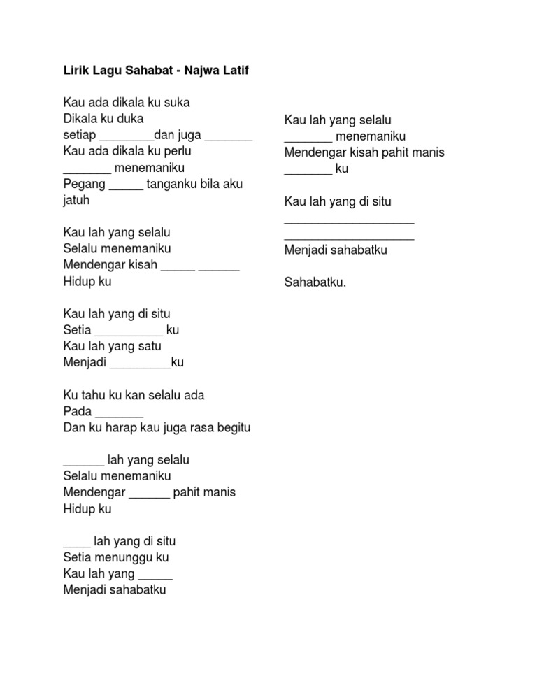 Lirik Lagu Sahabat Najwa Latif from imgv2-1-f.scribdassets.com Get the conversation started be the first to comment. Jun 25, 2016 · create and get +5 iq. Kau lah yang di situ setia menunggu ku kau lah yang satu menjadi sahabatku Lyrics to 'sahabat' by najwa latif. Nar records sdn bhdproduction : Kau lah yang selalu selalu menemaniku mendengar kisah pahit manis hidup ku. Kaulah yang di situ setia menungguku kaulah yang satu menjadi sahabatku Kaulah yang selalu selalu menemaniku mendengar kisah pahit manis hidupku.
